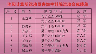 沈陽計算所取得如此好的成績,與所領(lǐng)導(dǎo)高度重視、運動員們平時堅持刻苦訓(xùn)練及各部門領(lǐng)導(dǎo)和同志們大力支持分不開的,這是沈陽分院的榮譽(yù),同時也是沈陽計算所的光榮。